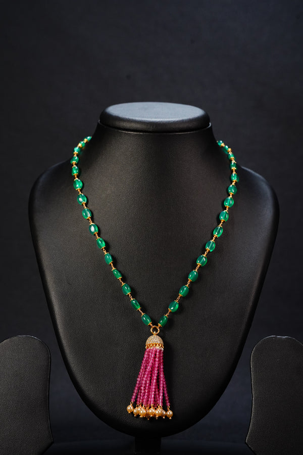 Trendy single-line onyx necklace paired with a locket and soft pink tassels, adding a modern twist.