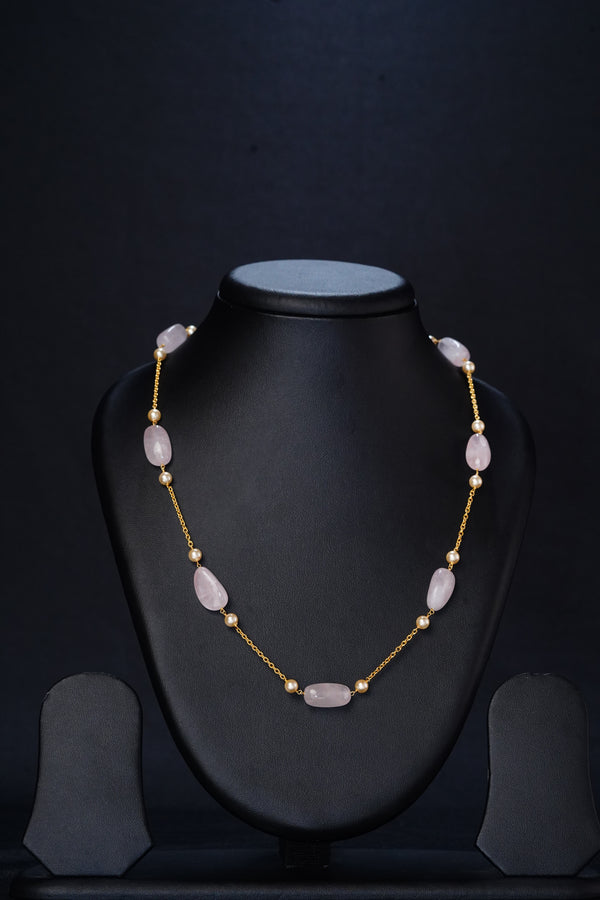 A delicate single-line necklace in 925 sterling silver, set with soft-hued rose quartz and lustrous pearls, radiating elegance and femininity. This masterpiece balances heritage and modern elegance—perfect to elevate festive attire, wedding celebrations, or evening ensembles. Designed to embrace sophistication with a royal touch, it’s a timeless jewel to treasure.